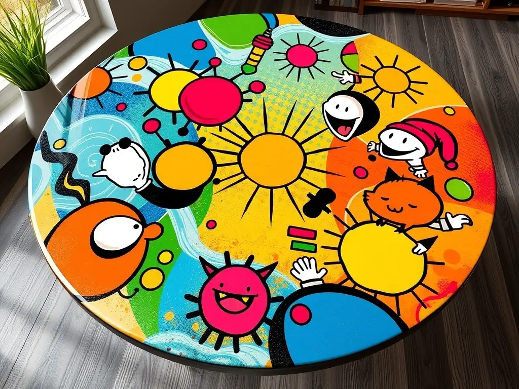 Playful resin tables for kids’ rooms, featuring bright colors and fun character images, crafted with care.